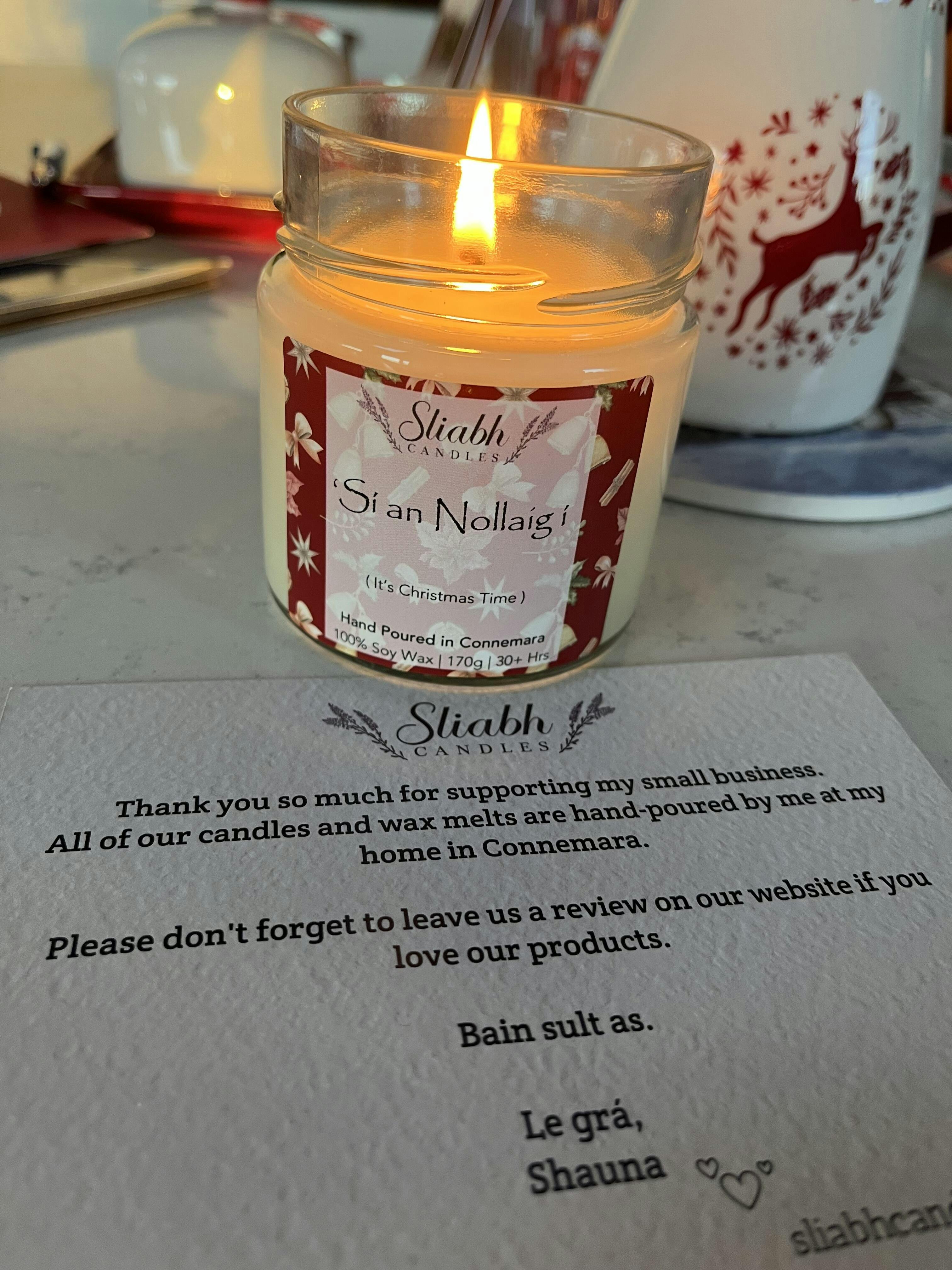 Each candle is hand-poured in Connemara, Co. Galway, using 100% natural soy wax for a clean, even, and long-lasting burn.